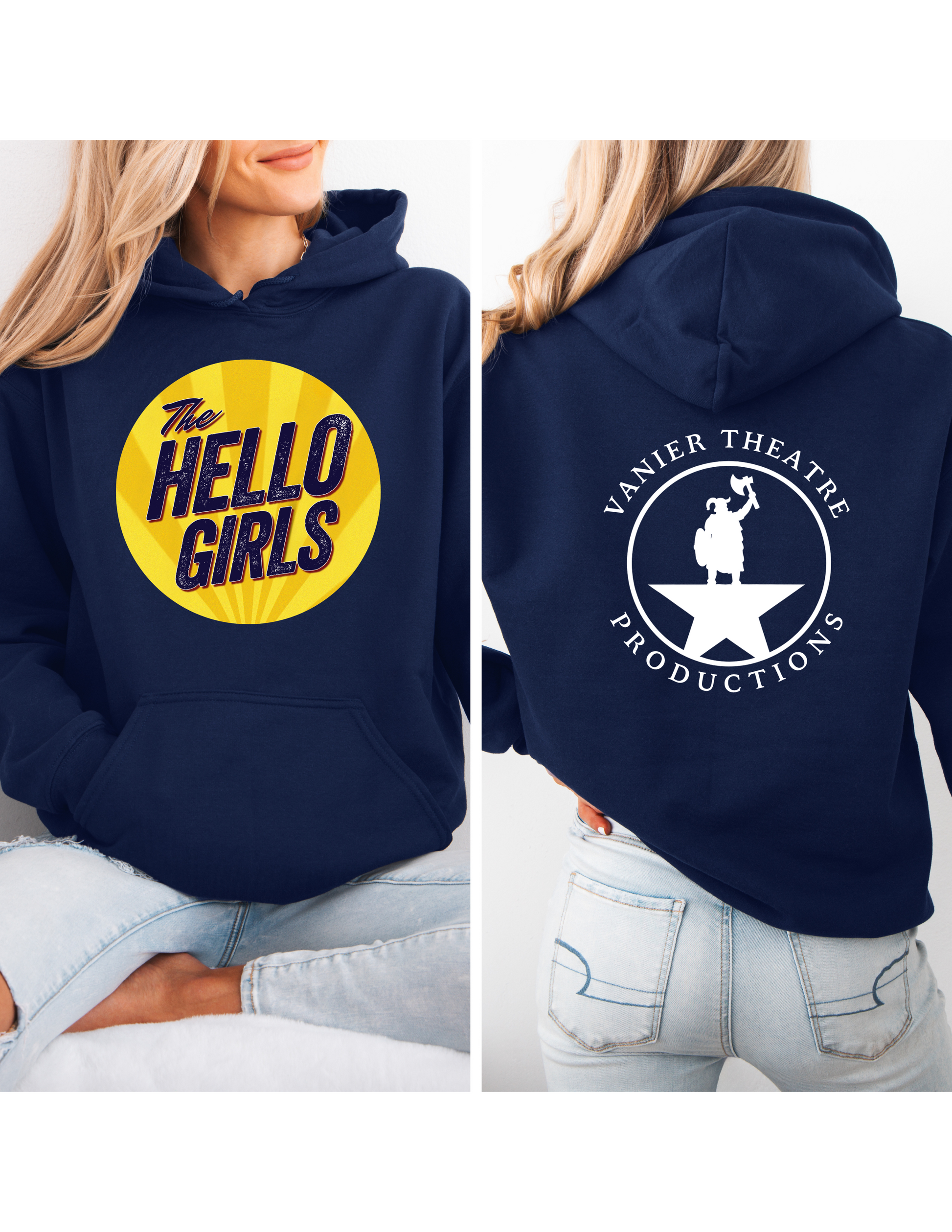 This unisex Hello Girls Hoodie offers a soft, cozy fit perfect for everyday wear. Available in blue or grey, it features the Vanier Theatre logo on the back and a charming yellow circle with "hello girls" on the front, blending comfort with subtle, stylish branding. Ideal for fans and supporters seeking both warmth and a distinctive look.