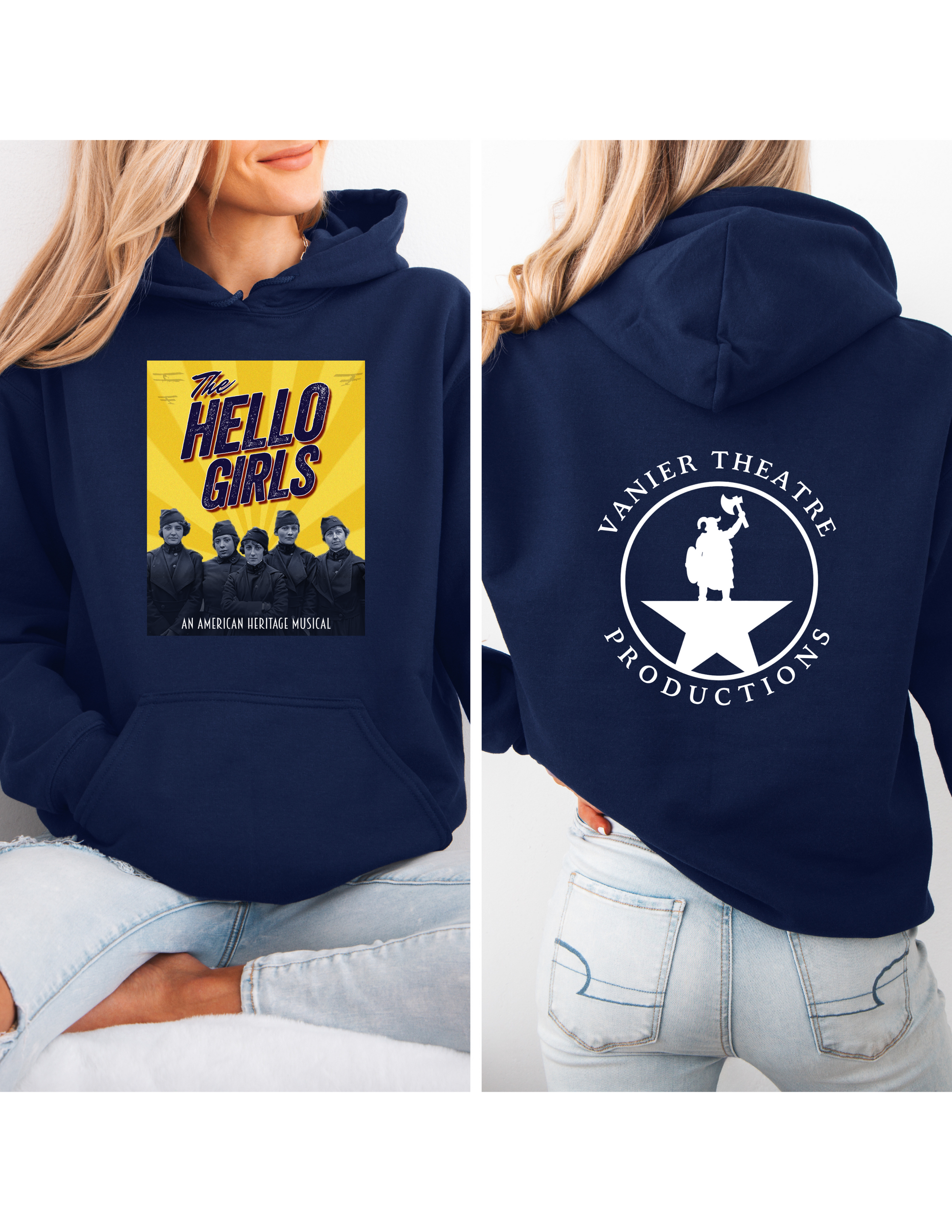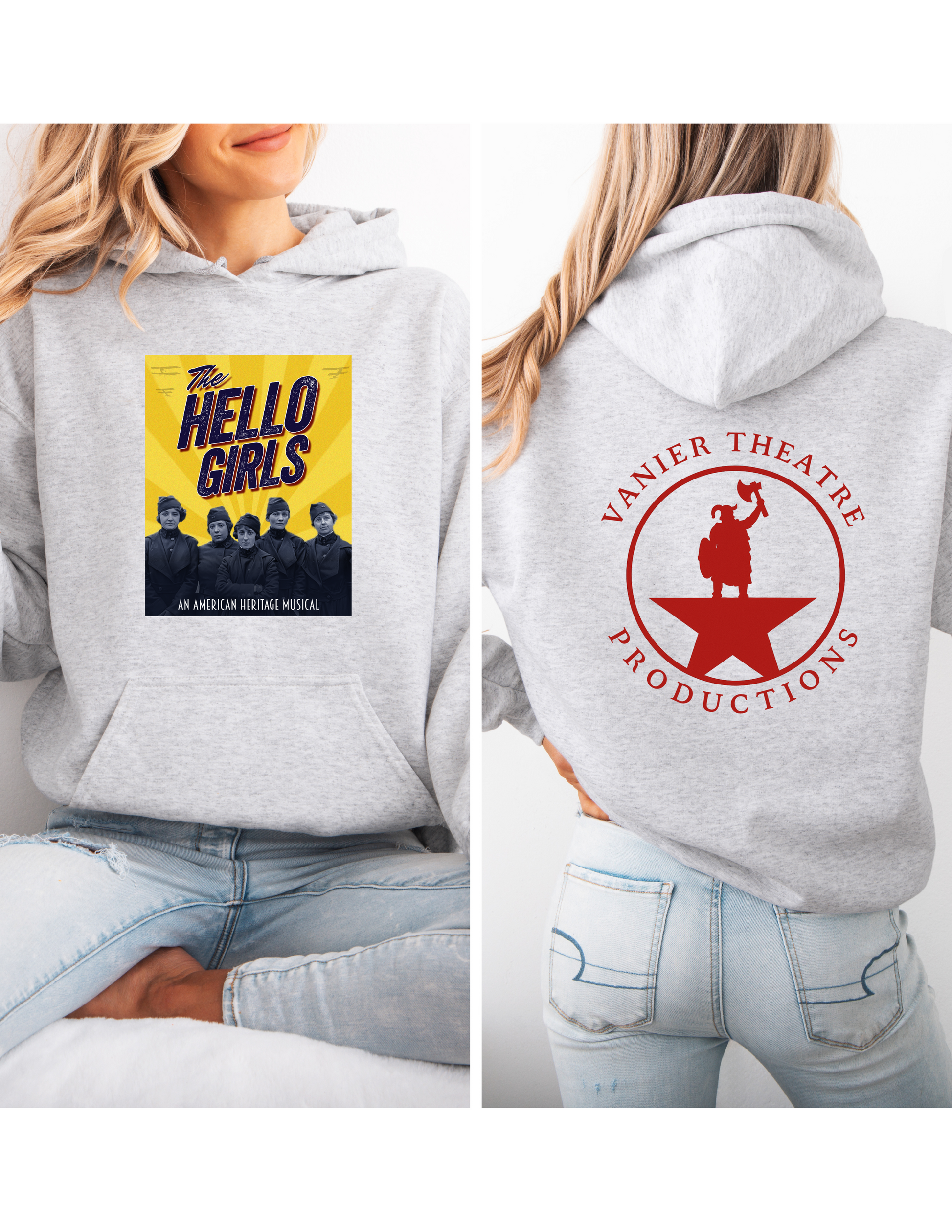 This unisex Hello Girls Hoodie offers a soft, cozy fit perfect for everyday wear. Available in blue or grey, it features the Vanier Theatre logo on the back and a charming yellow poster with "hello girls" on the front, blending comfort with subtle, stylish branding. Ideal for fans and supporters seeking both warmth and a distinctive look.