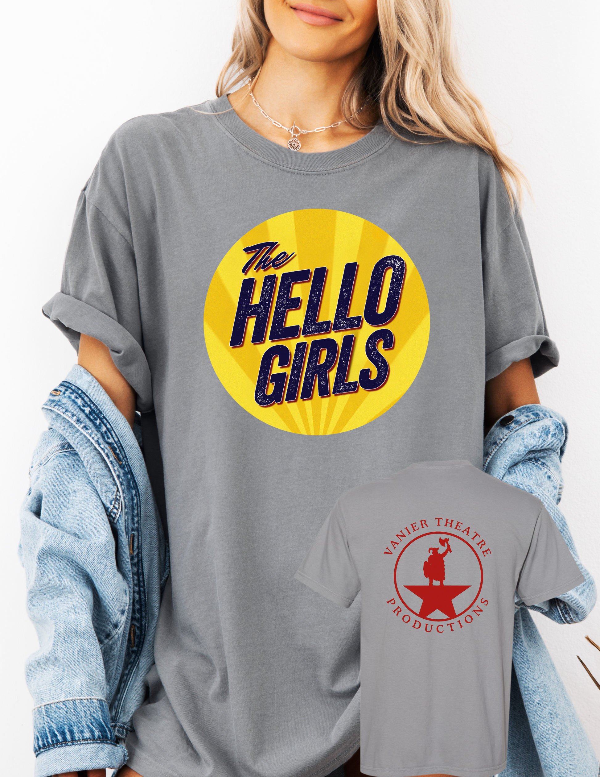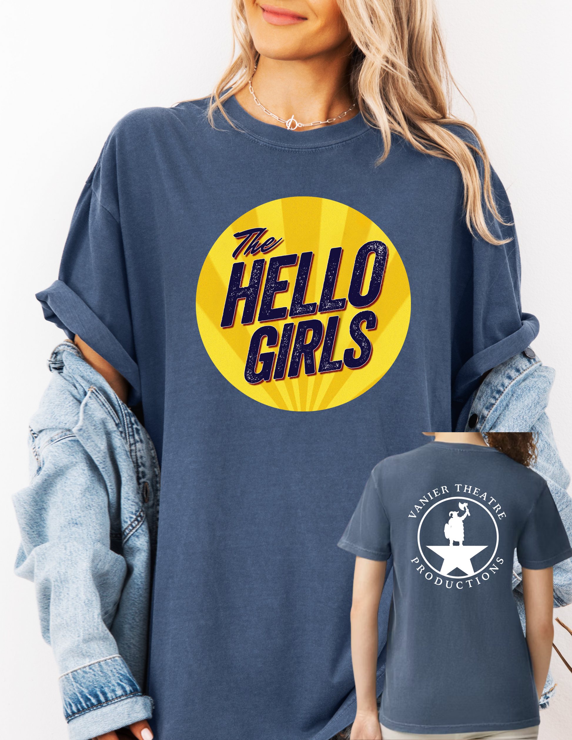 This unisex Comfort Colours T-shirt offers a relaxed, boxy fit for all-day comfort. Featuring the Vanier Theatre logo on the back and a distinctive yellow circle "Hello Girls" logo, it combines style with subtle branding. Ideal for casual wear, this shirt balances quality fabric with a flattering cut.