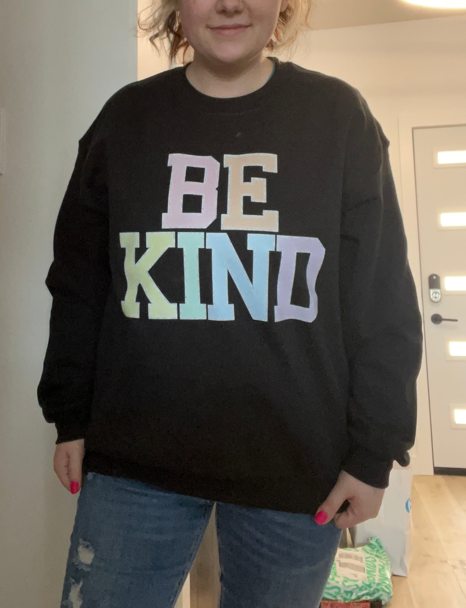 Be kind in large pastel letters on a black crewneck 🥰